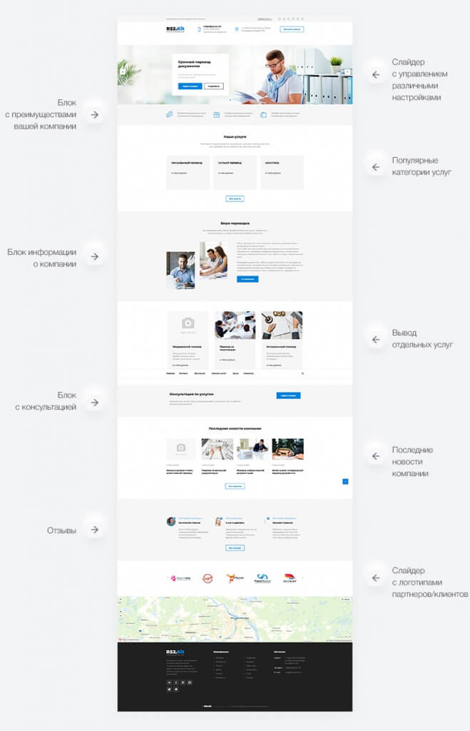 Главная страница содержит элементы, помогающие эффективно донести ваше предложение до потенциального клиента.